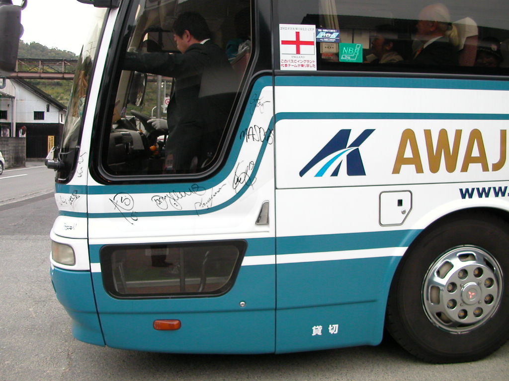 観光バスの一台にいっぱいサインがしてある。しかもはがれない様シールで保護してある。窓を見ると白地に赤の十字のイングランド旗。そう、このバス、2002年のFIFAワールドカップの際、淡路島でキャンプをしたイングランドチームの送迎に使われた淡路交通のバスで、サインはイングランド代表メンバーのものだったのです!